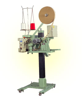 Single needle machine exclusively designed for crepe-tape bound closing of filled bags made of multi-wall paper. Equipped with mechanically operated lever controlled cutting mechanism for automatic cutting of crepe-tape.